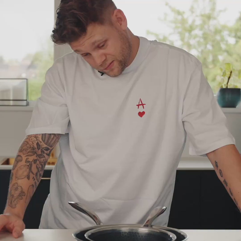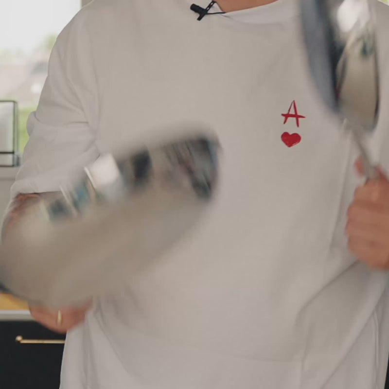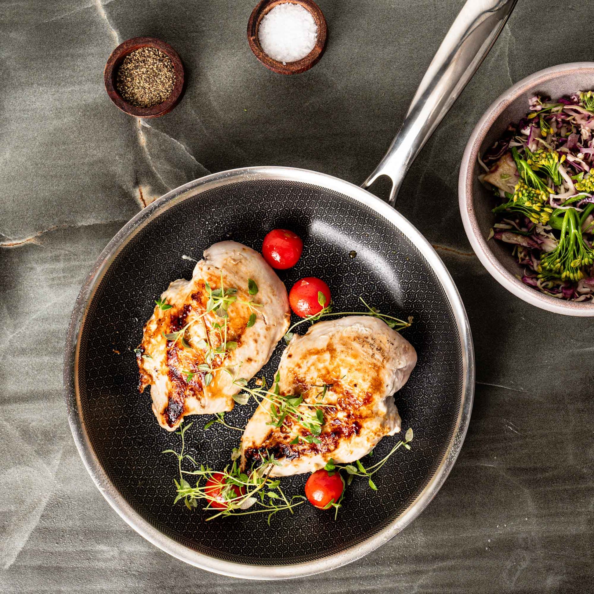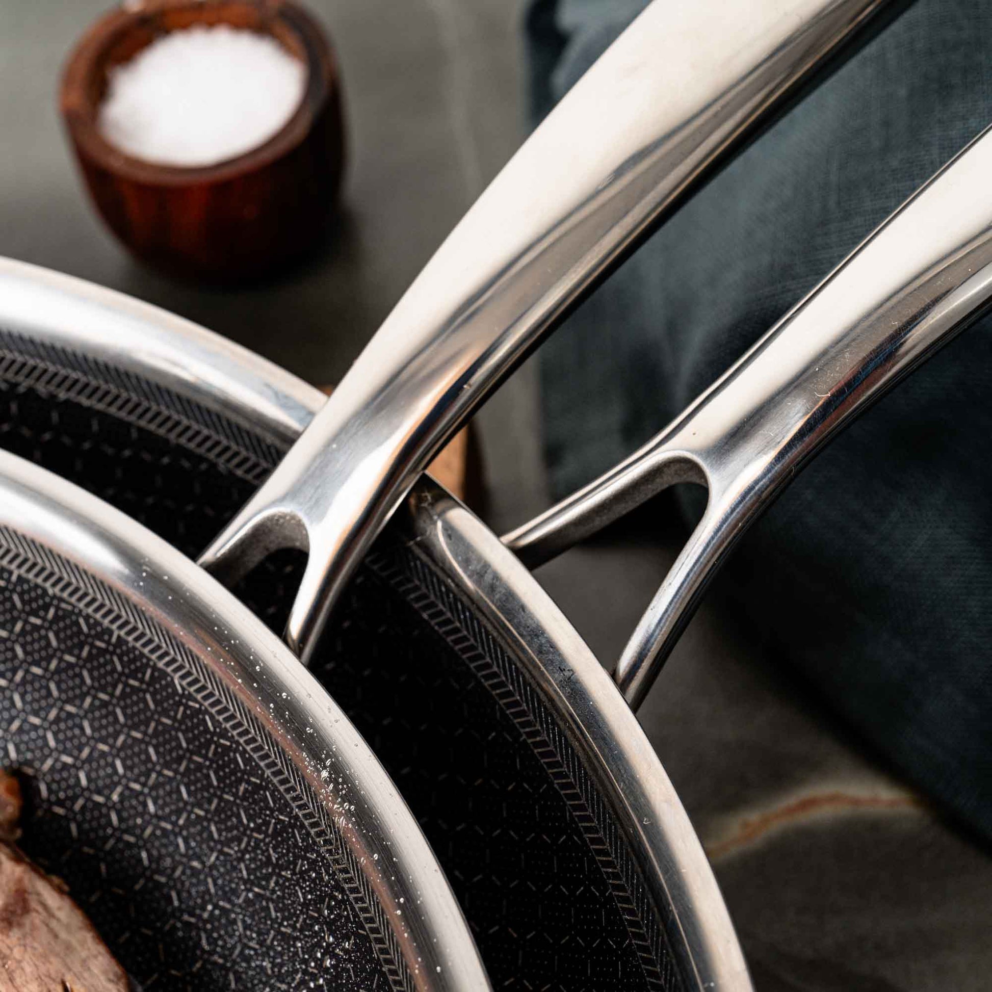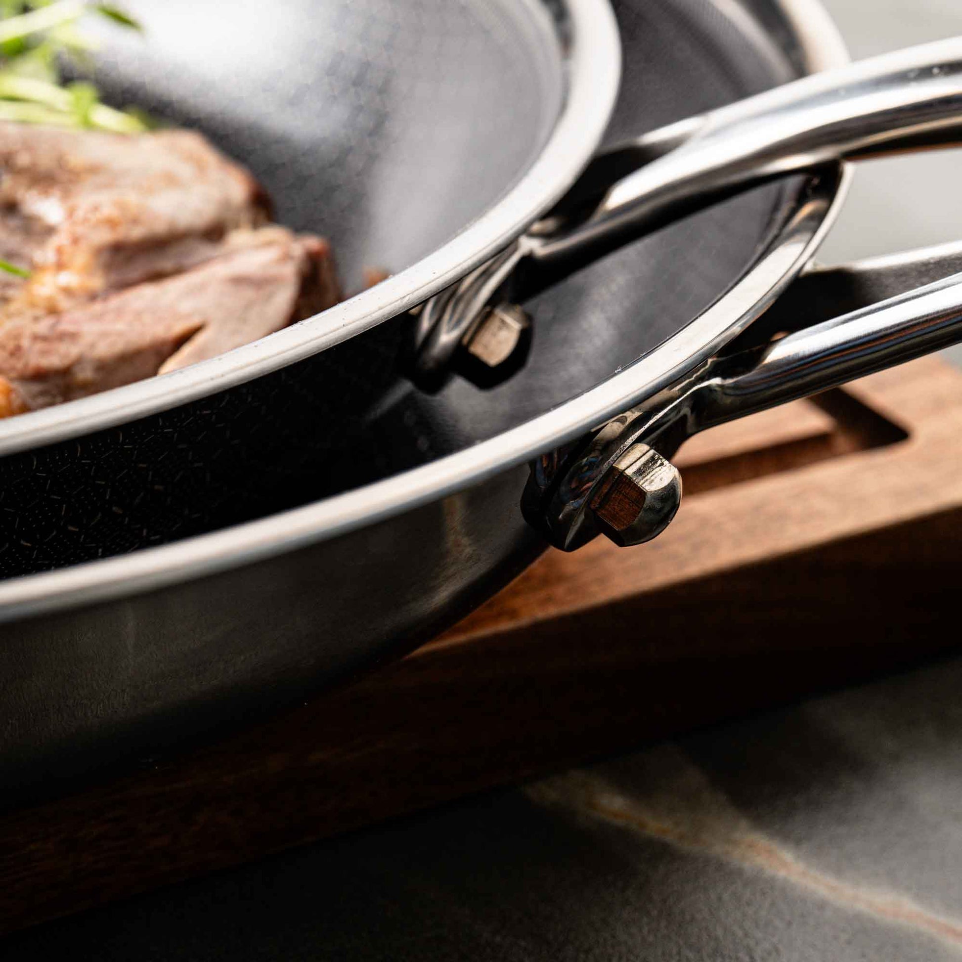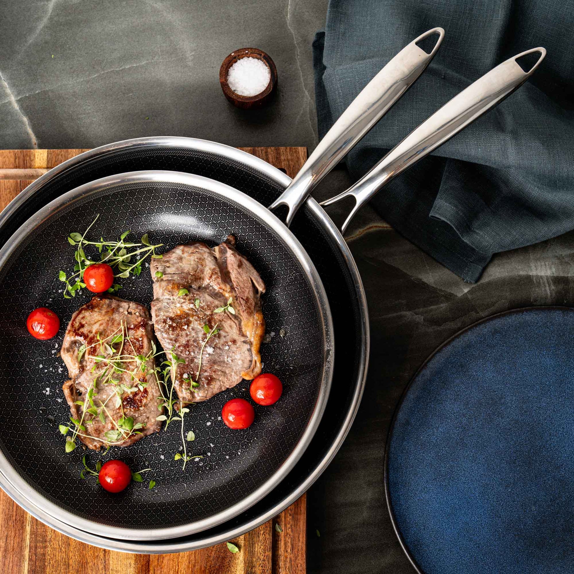 Derfor vil du elske hybrid-panderne: Du får den perfekte stegeskorpe (som på stål), men med en overflade, der slipper let. Det betyder mindre fedtstof, nemmere rengøring og madlavning uden drama.
