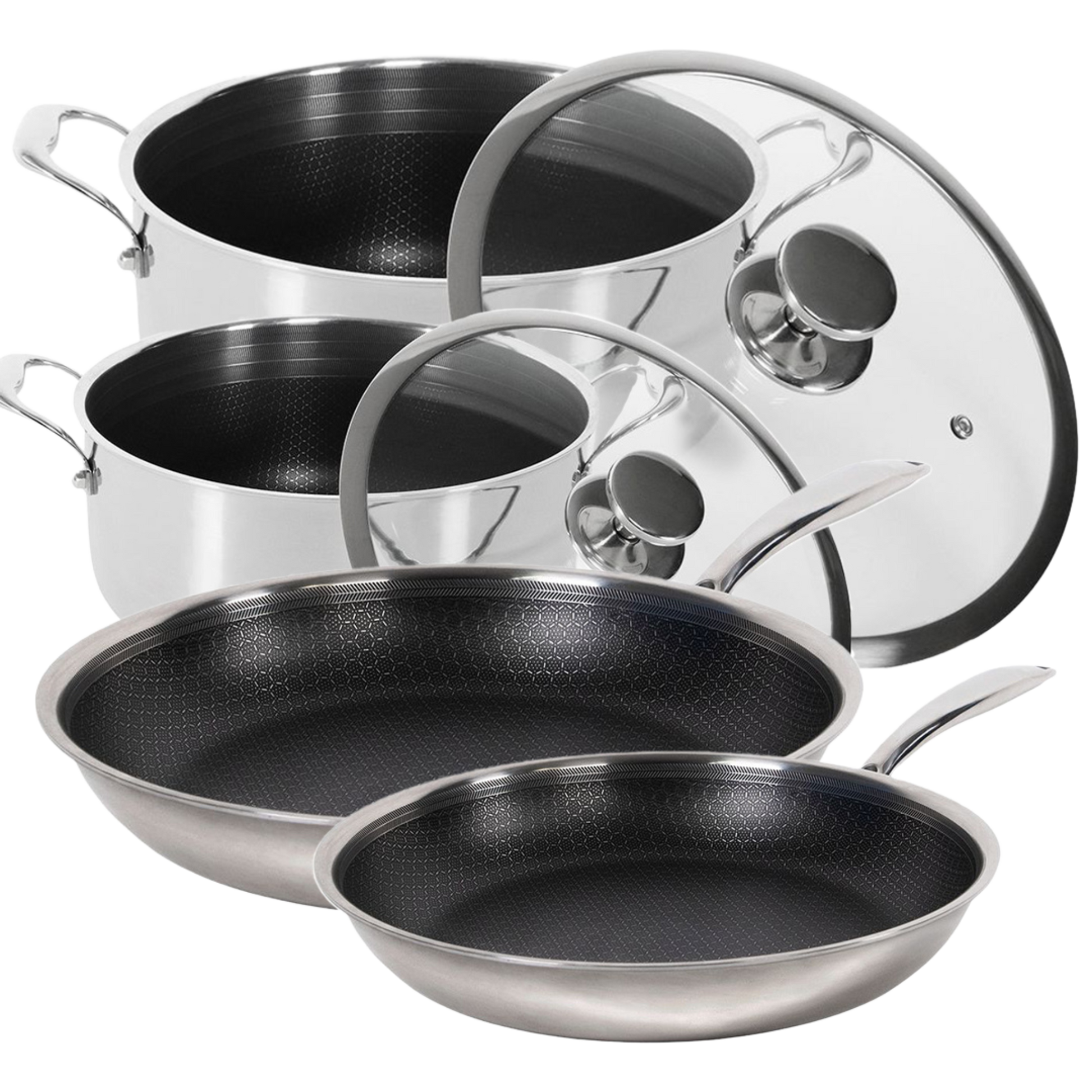 Med det her bundle får du både to Hybrid Non-Stick Gryder og to Hybrid Non-Stick Stegepander – et sæt, der dækker langt de fleste behov i hverdagen. Gryderne på Ø20 (2,9 liter) og Ø24 (5 liter) er perfekte til alt fra saucer og kartofler til store portioner suppe, mens panderne på Ø24 og Ø28 klarer både hurtige retter og store stege.