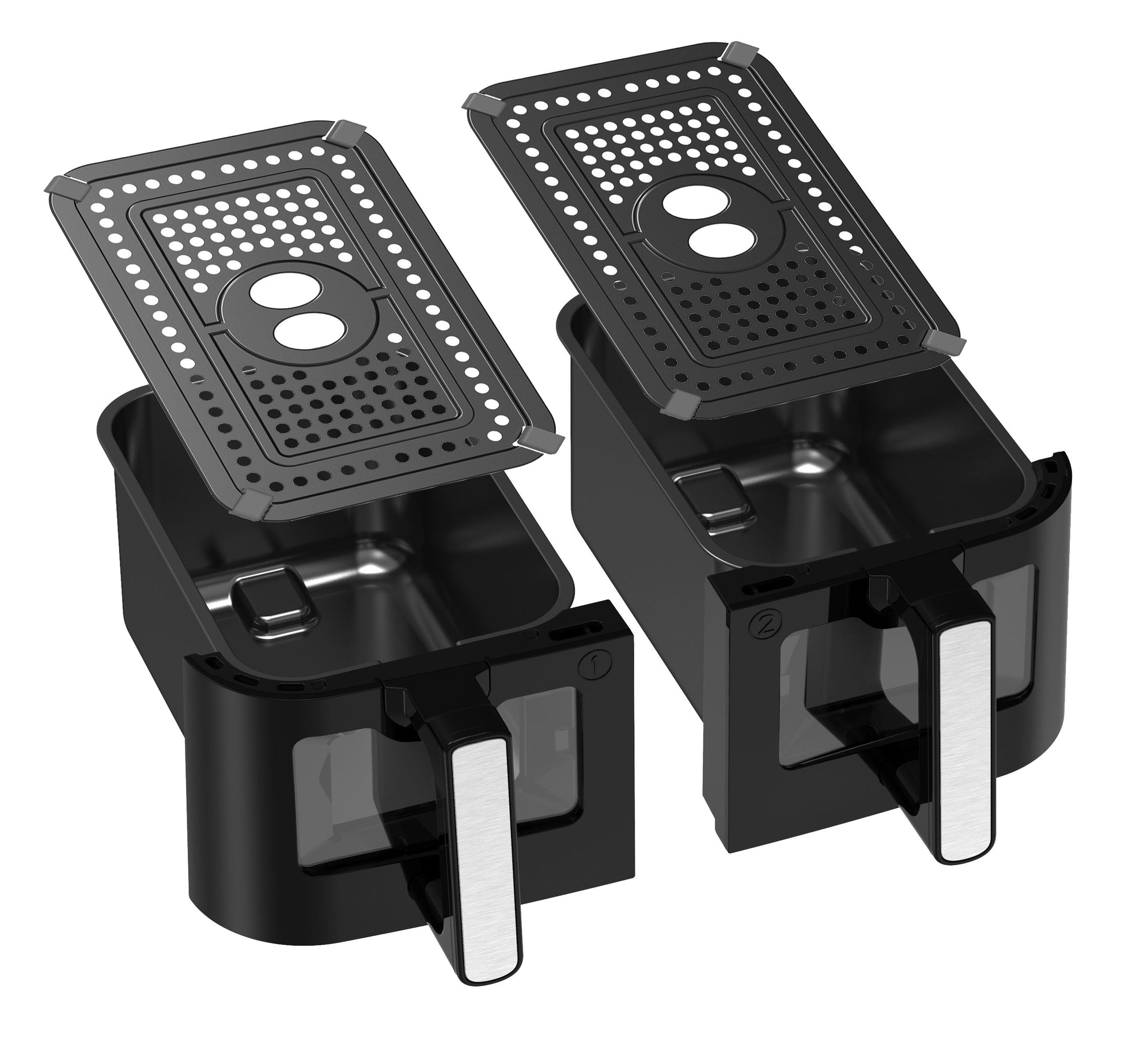 Med Dual Zone teknologien kan du styre tid og temperatur individuelt i de to skuffer. Det betyder, at du kan tilberede sprøde pommes frites i den ene side og saftig kylling i den anden – samtidig og med perfekt resultat. Den keramiske belægning sikrer, at maden ikke brænder fast, og gør rengøringen enkel.