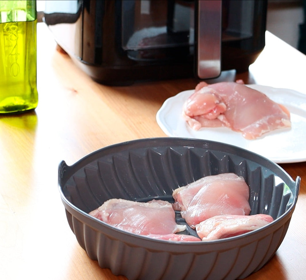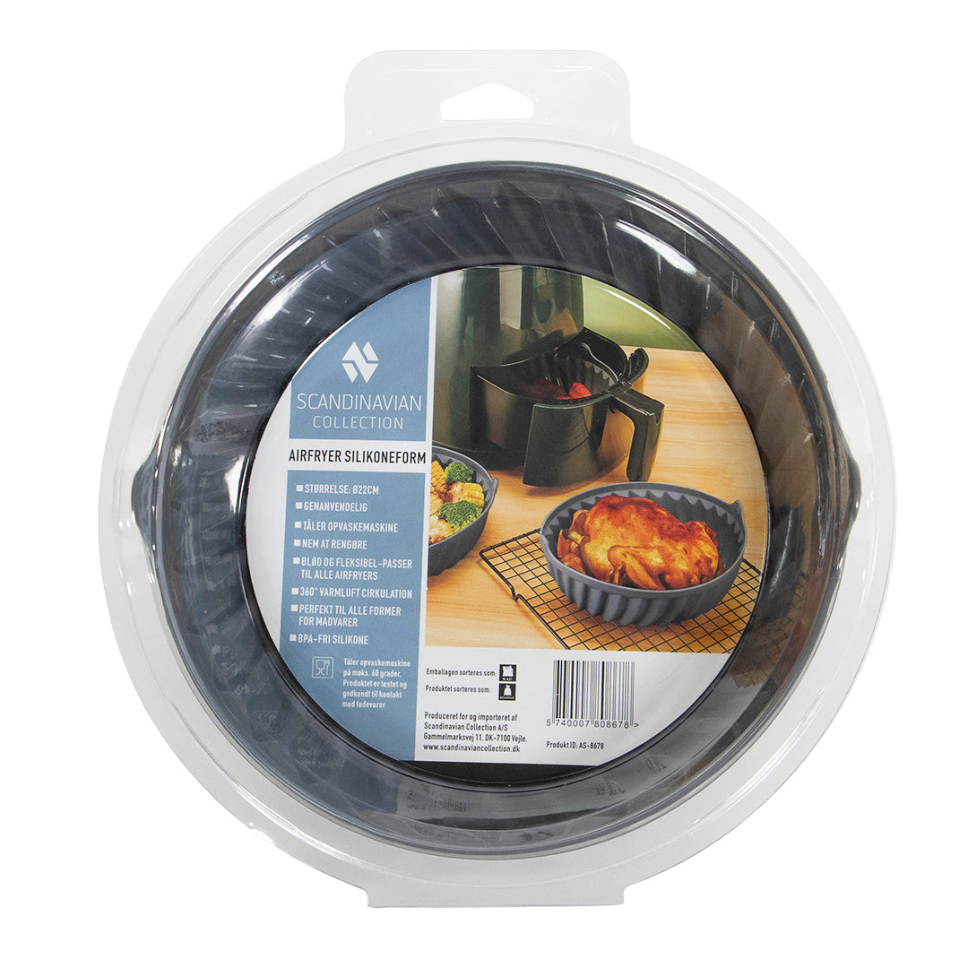 Den elegante mørkegrå form er fremstillet i fleksibel silikone, der tåler høje temperaturer og kan bruges igen og igen. Den passer perfekt til de fleste airfryere op til 6 liter og er ideel til alt fra grøntsager til kød og bagværk.