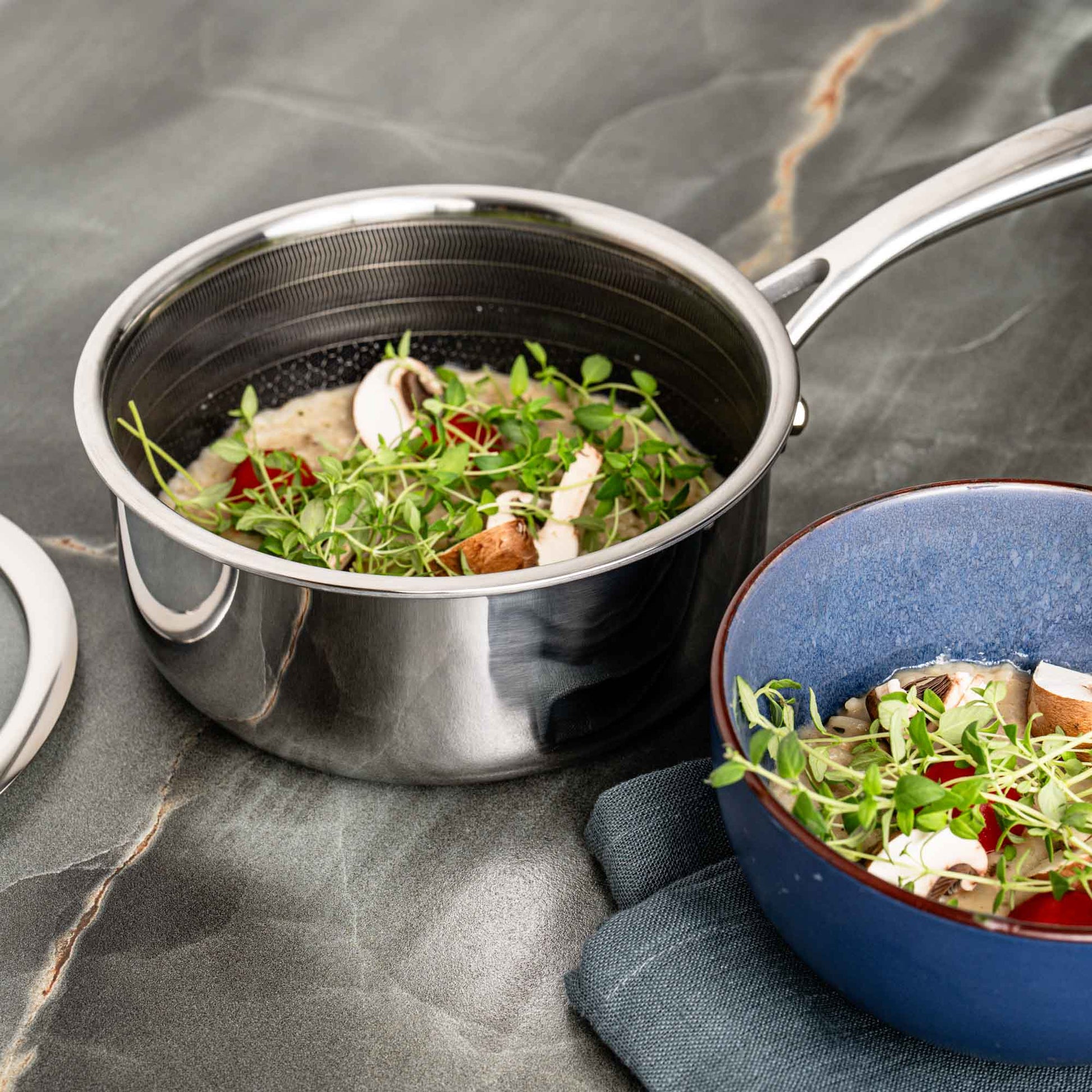 Alle dele er fremstillet i tre lag stål med en keramisk non-stick belægning, der er helt fri for PFAS. Det betyder, at du kan lave mad med fuld tryghed – og stadig få den perfekte stegeskorpe, nem rengøring og en holdbarhed, der gør, at sættet kan følge dig i mange år.