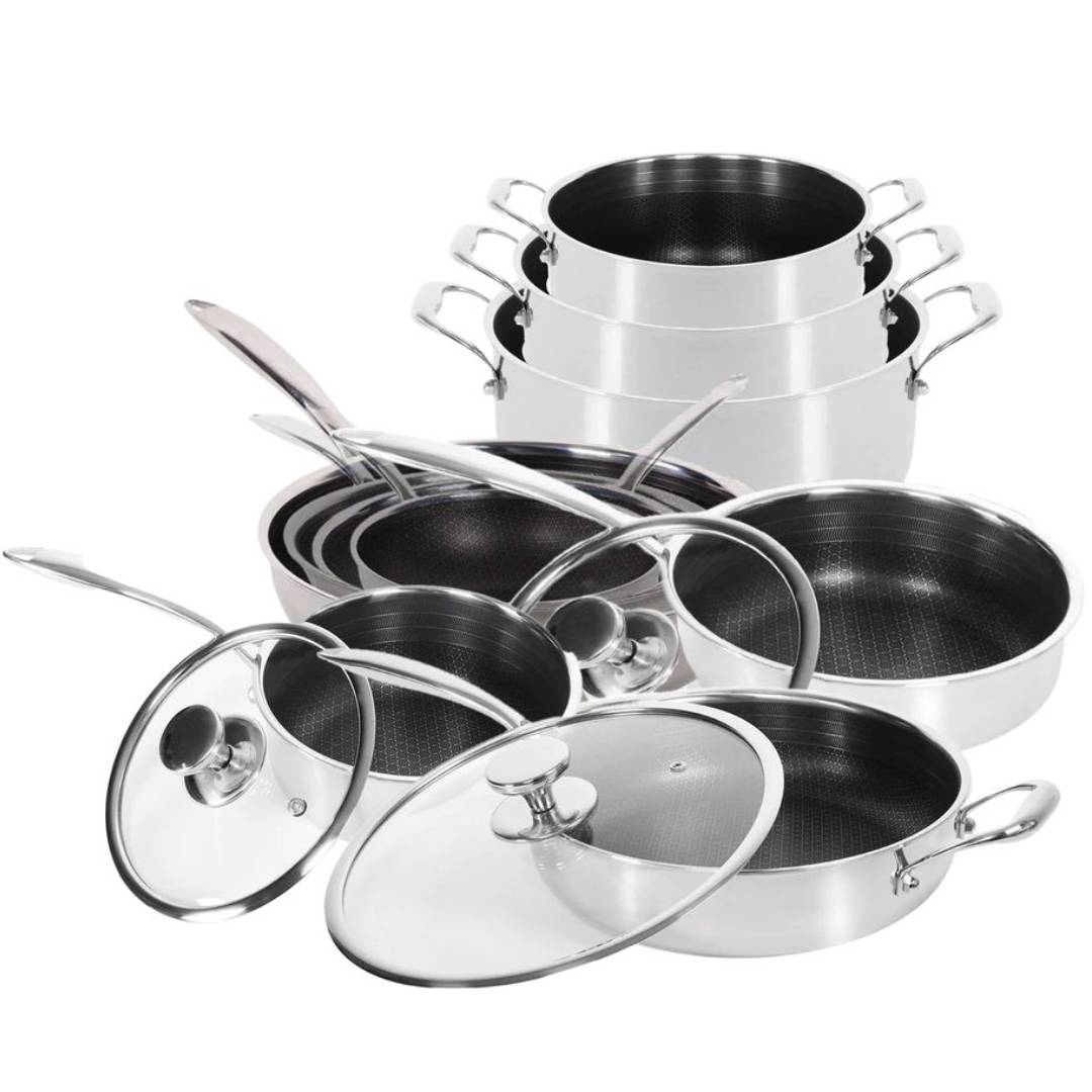 Dette store Hybrid Non-Stick Bundle er til dig, der vil have et komplet køkken med redskaber i professionel kvalitet. Du får tre stegepander i Ø20, Ø24 og Ø28, tre gryder i Ø20 (2,9 liter), Ø24 (5 liter) og Ø28 (7,1 liter), en kasserolle i Ø16 (1,3 liter), en wok og en sauterpande. Det er udstyr, der kan klare alt – fra hurtige hverdagsretter til store middage med gæster.