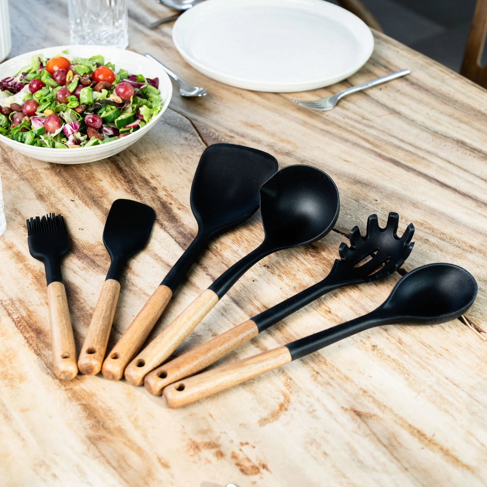 Sættet fuldendes med seks køkkenredskaber i et flot mix af silikone og træ. De ligger behageligt i hånden, skåner dine gryder og pander og giver samtidig et stilrent udtryk i køkkenet.