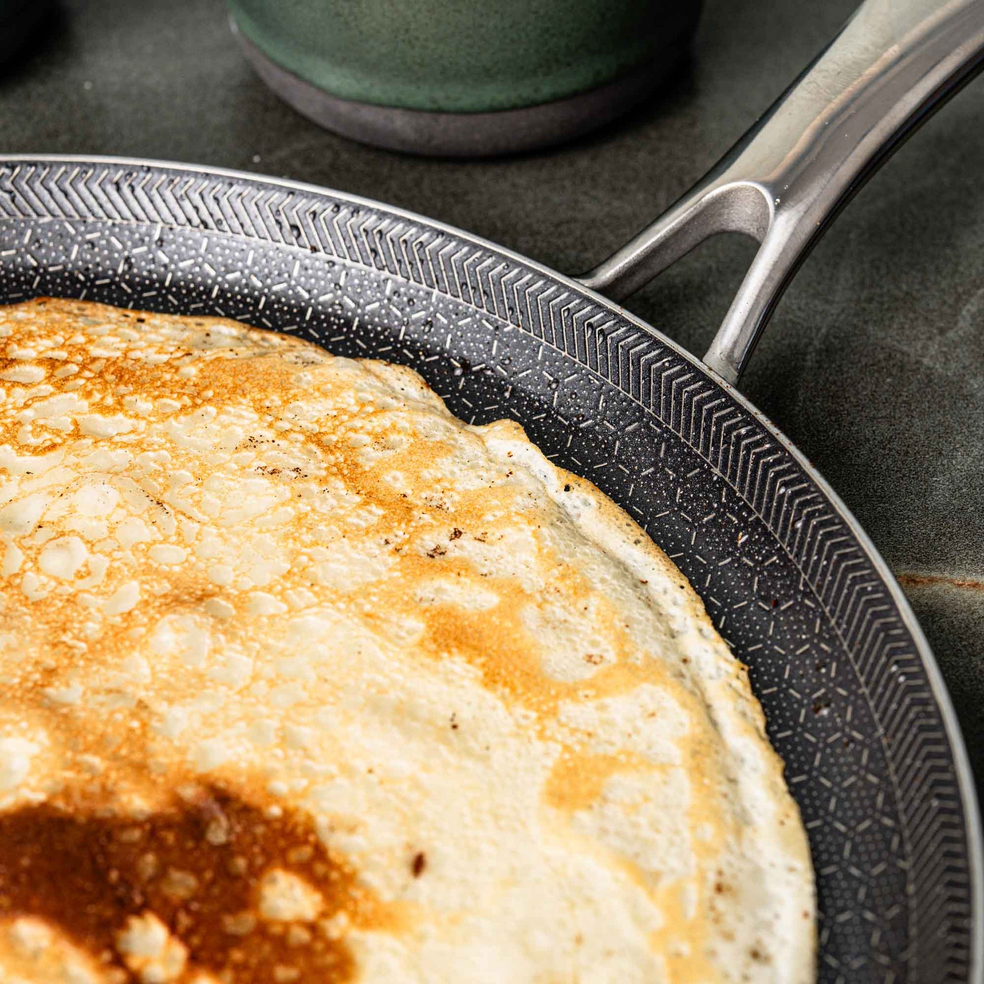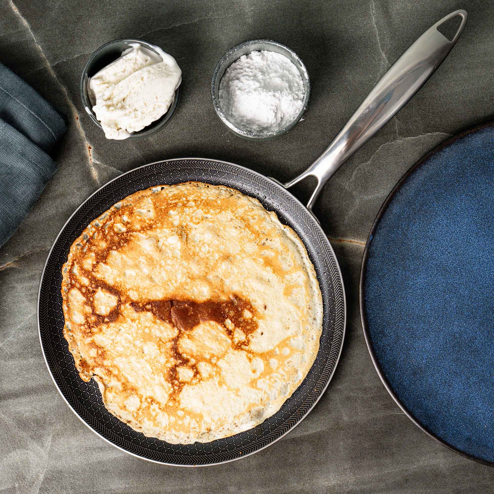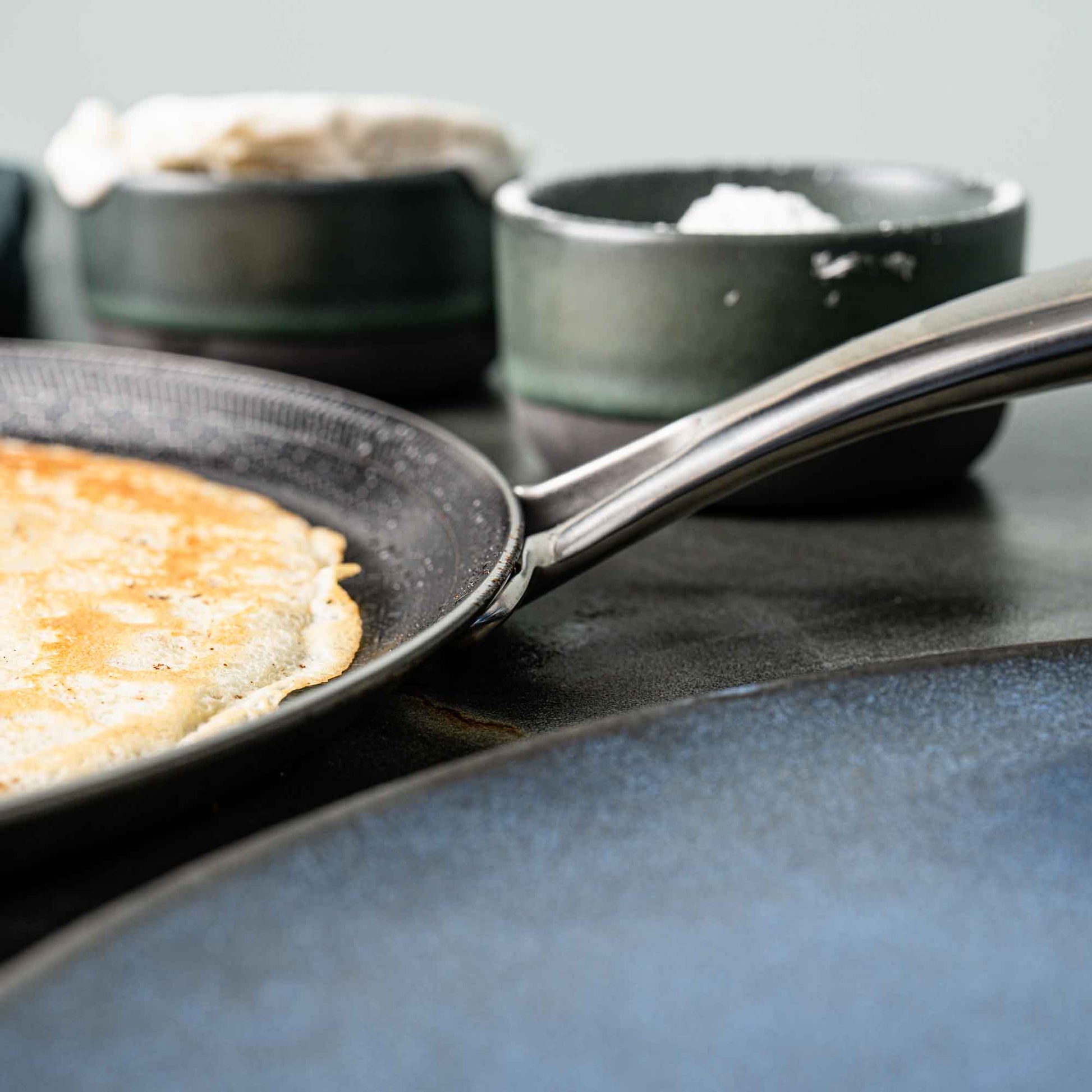 Panden er dog langt mere end en pandekagepande. Den fungerer også til bøffer, pizza eller grillede grøntsager, hvilket gør den til et alsidigt værktøj i dit køkken. Belægningen er fri for PFAS, tåler metalredskaber og gør rengøringen enkel – også i opvaskemaskinen.
