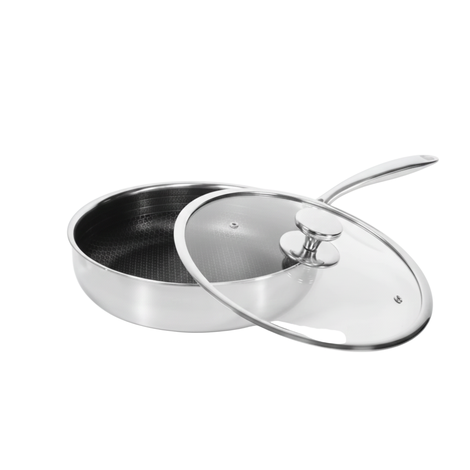 Panden er bygget i tre lag: rustfrit stål, aluminium for optimal varmefordeling og endnu et lag rustfrit stål for ekstra holdbarhed. Til sidst forseglet med den slidstærke keramiske belægning, der gør hele forskellen i køkkenet.