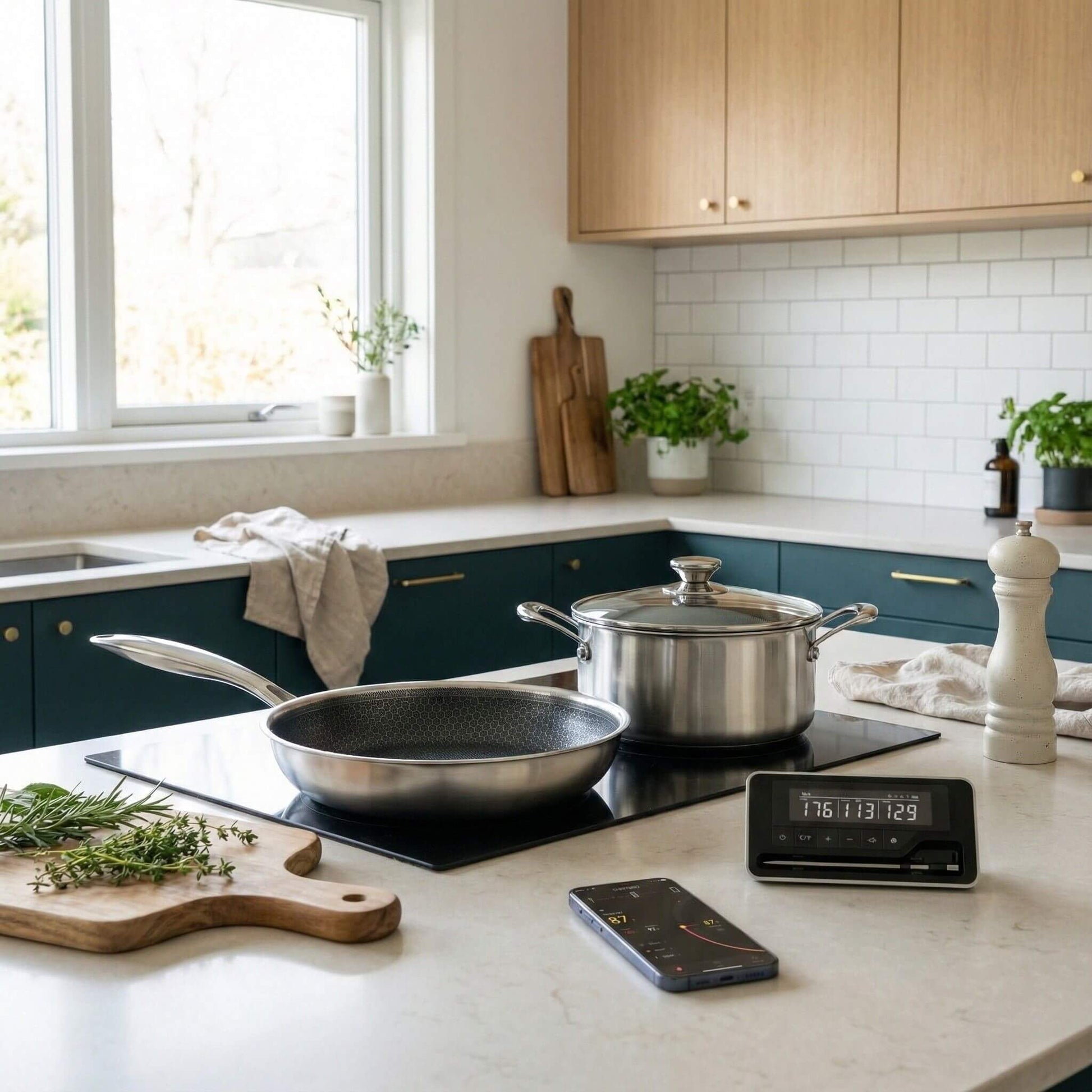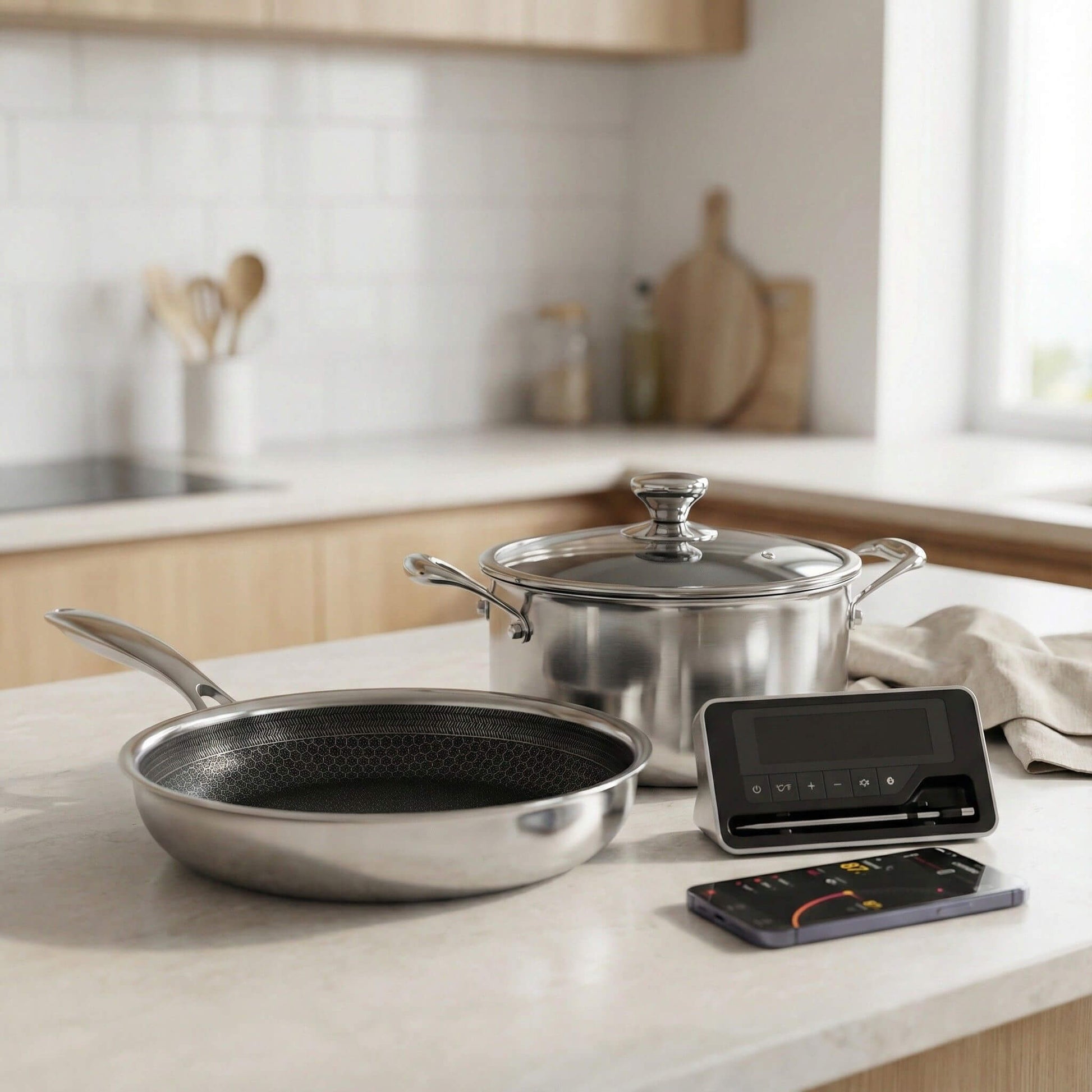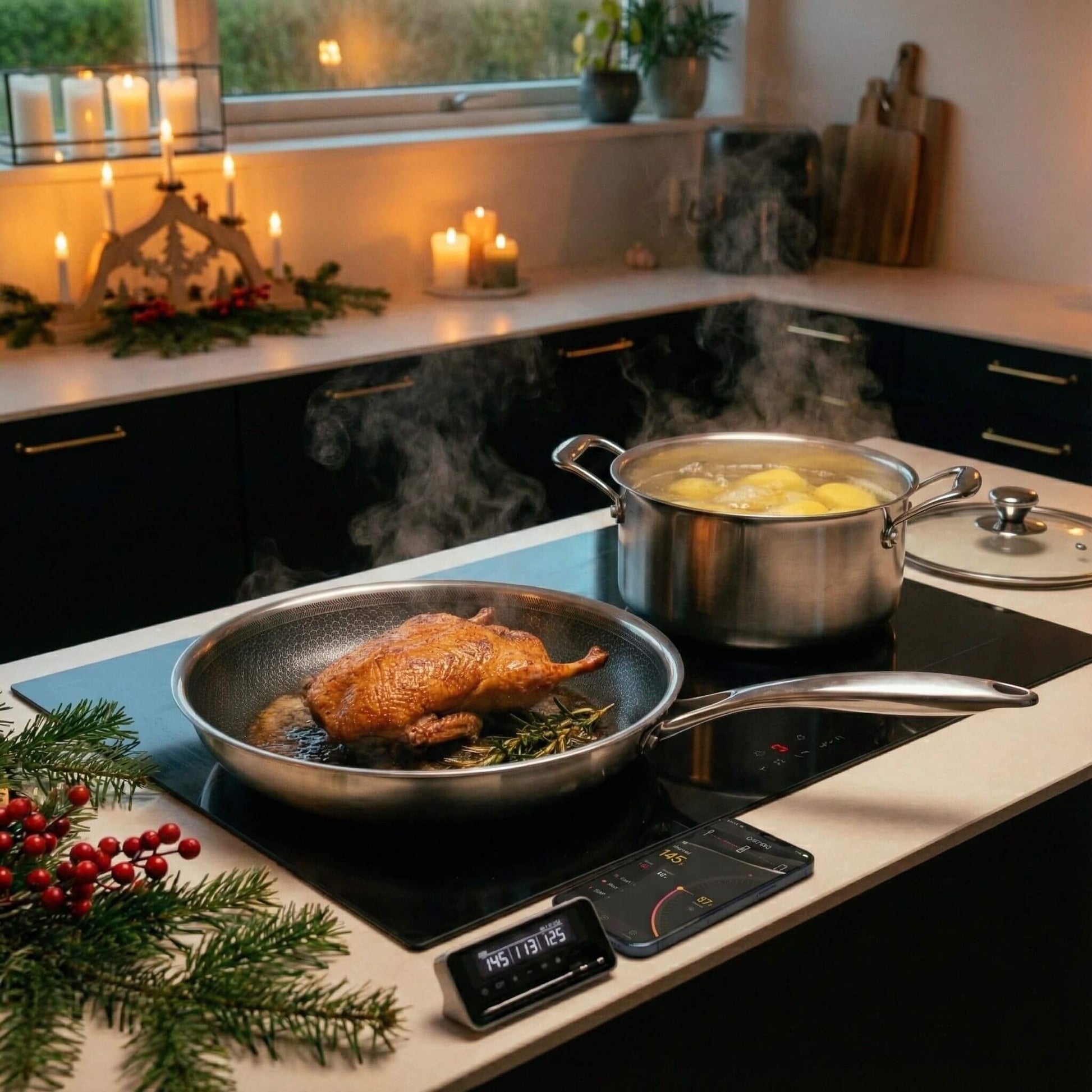 Med Julemiddagen på autopilot får du præcis det setup, jeg selv ville vælge derhjemme: én hybrid stegepande til at brune stegen og lave tilbehør, én hybrid gryde til kartofler og sovs – og et Bluetooth stegetermometer, der holder styr på kernetemperaturen for dig.