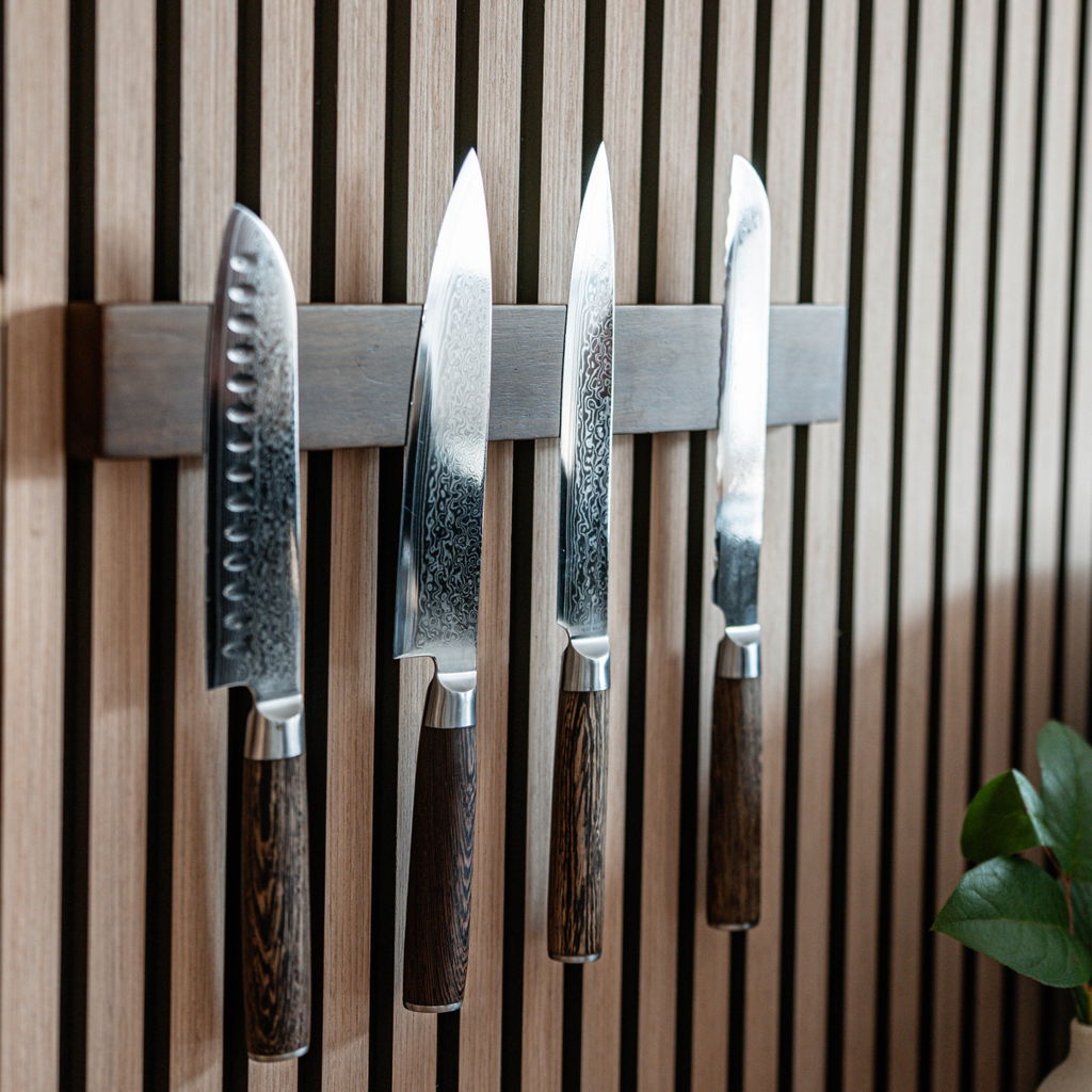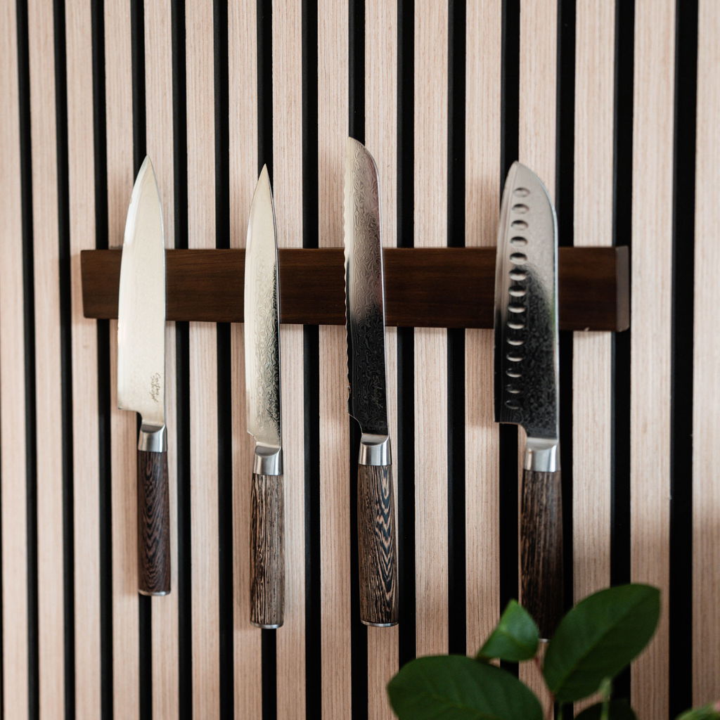 Knivholderen skaber et ryddeligt og stilrent udtryk på køkkenvæggen, hvor knivene er synlige og let tilgængelige. Den er perfekt til både professionelle kokke og passionerede hjemmekokke, der ønsker at kombinere nem adgang med æstetik.
