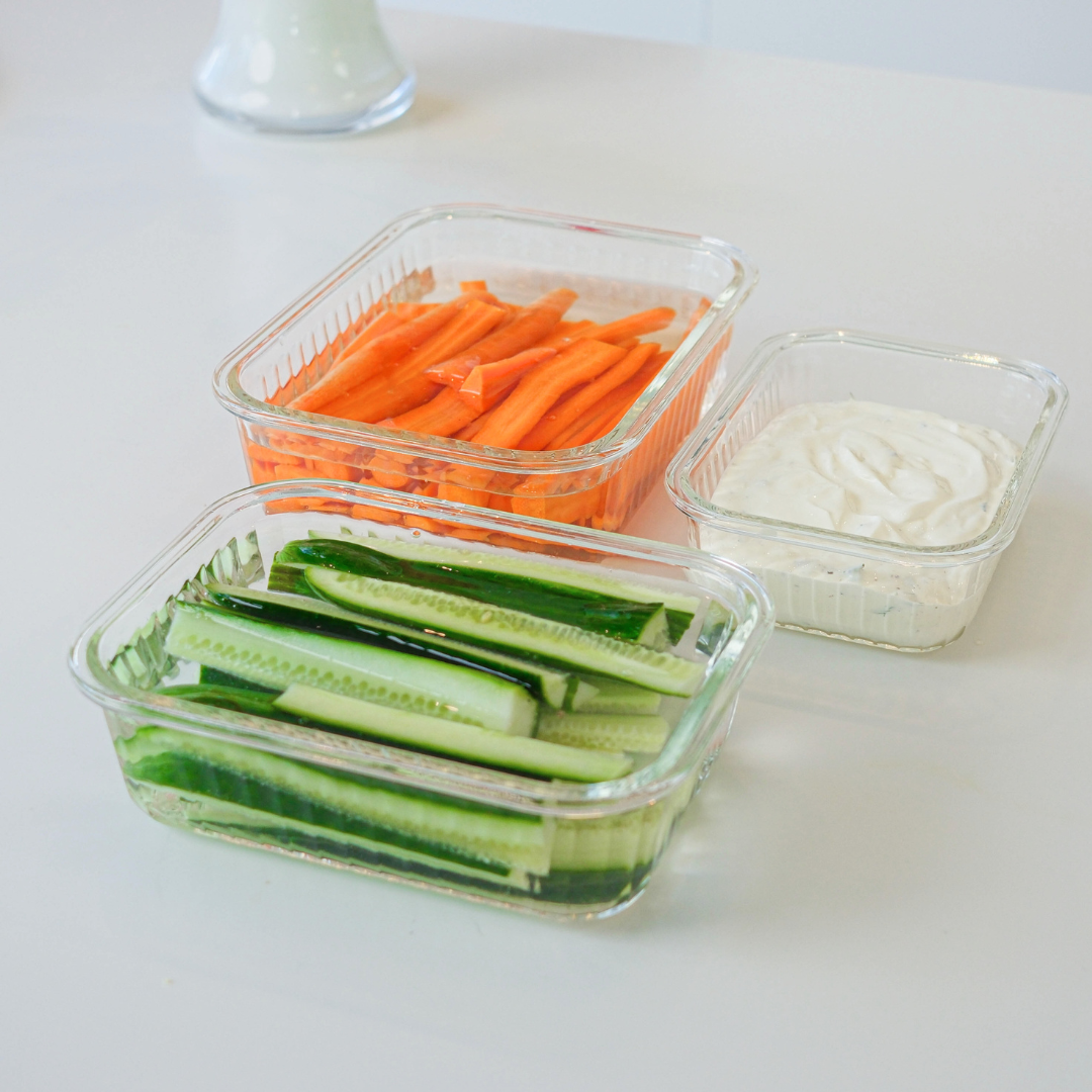 Beholderne er lavet af stærkt glas med tætsluttende plastlåg, der er godkendt til kontakt med fødevarer. De tåler opvaskemaskine op til 60 °C (og jeg anbefaler, at du lige vasker dem inden første brug). De er stabelbare, så de fylder minimalt i skuffen eller i skabet, og du kan også sagtens servere direkte i dem, hvis du vil gøre det nemt for dig selv.
