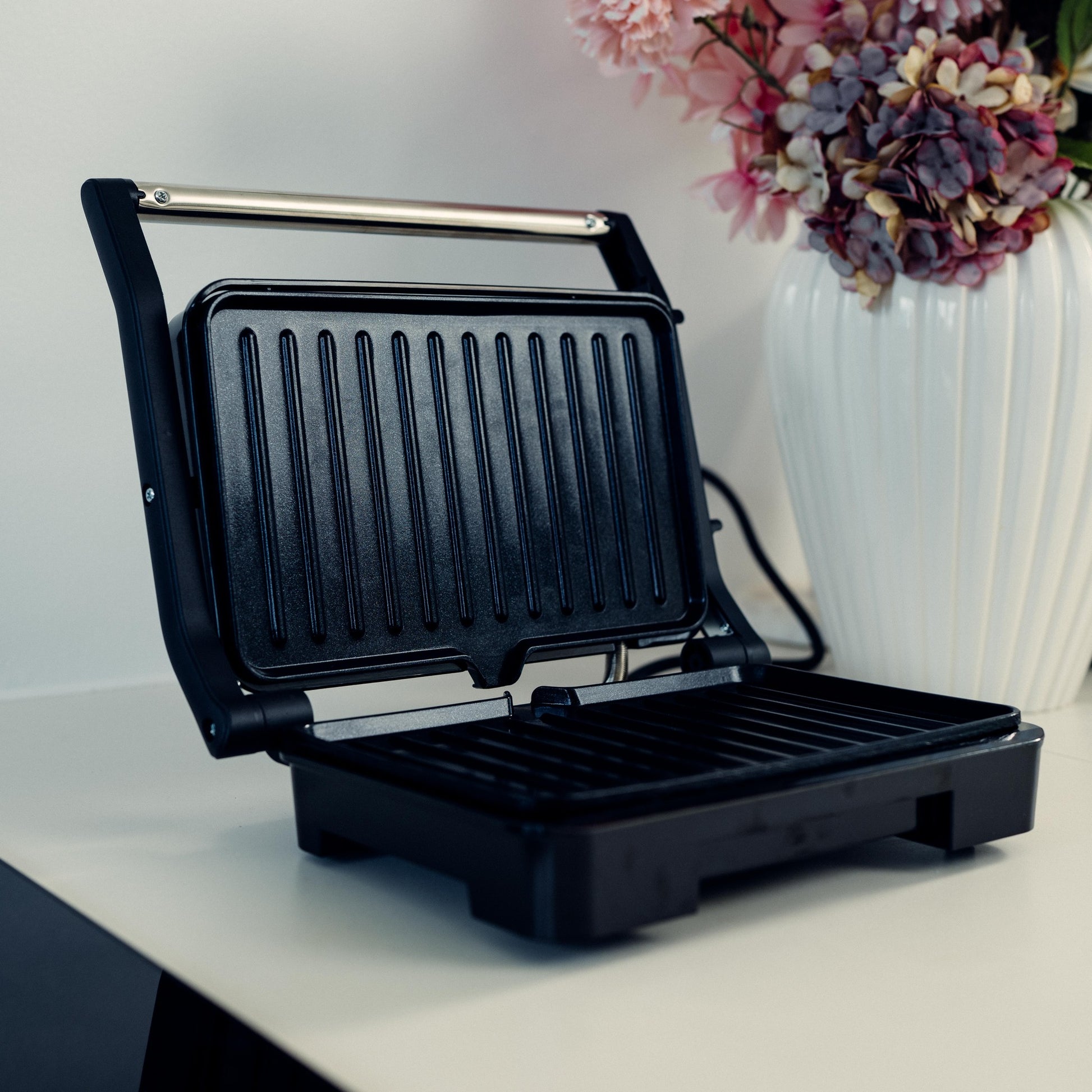 Grillen kan bruges både som almindelig panini grill eller åbnes helt til 180 grader og fungere som bordgrill. Det gør den ideel til både små måltider og større retter. Det varmebestandige håndtag og den sikre låsemekanisme giver dig tryghed og nem håndtering i hverdagen.