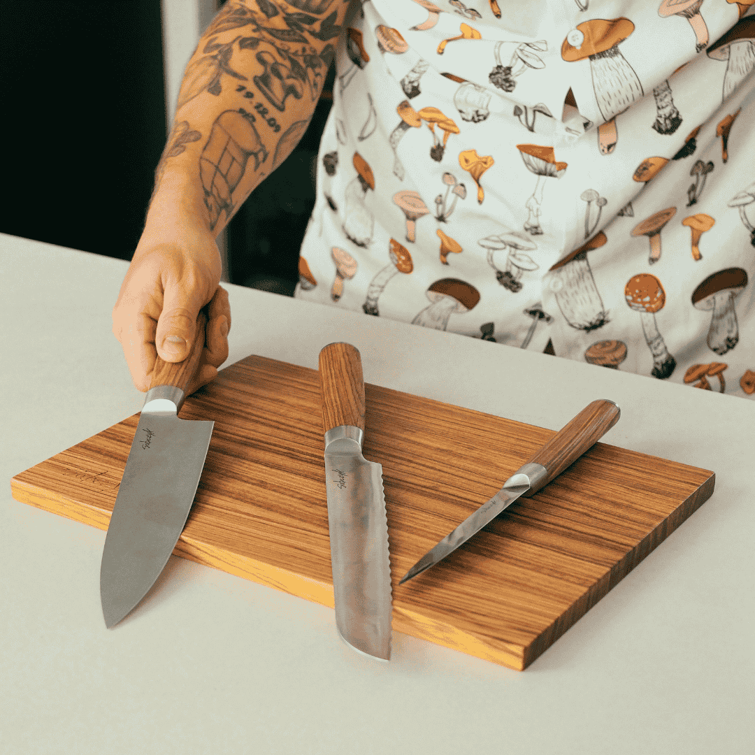 Sæt Med 3 Knive + Skærebræt i Zebratræ