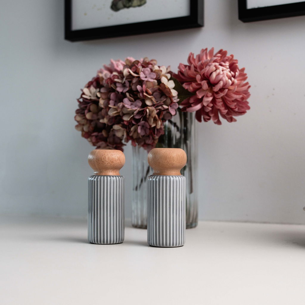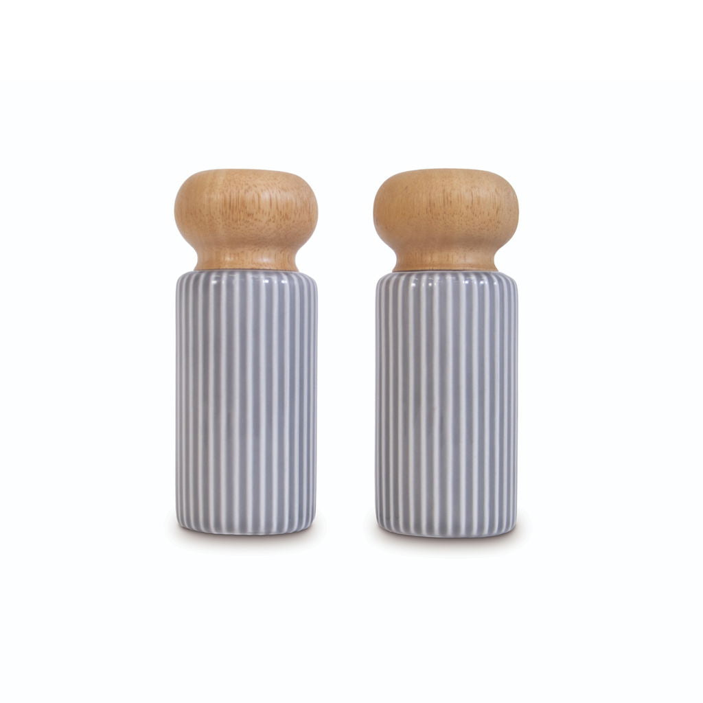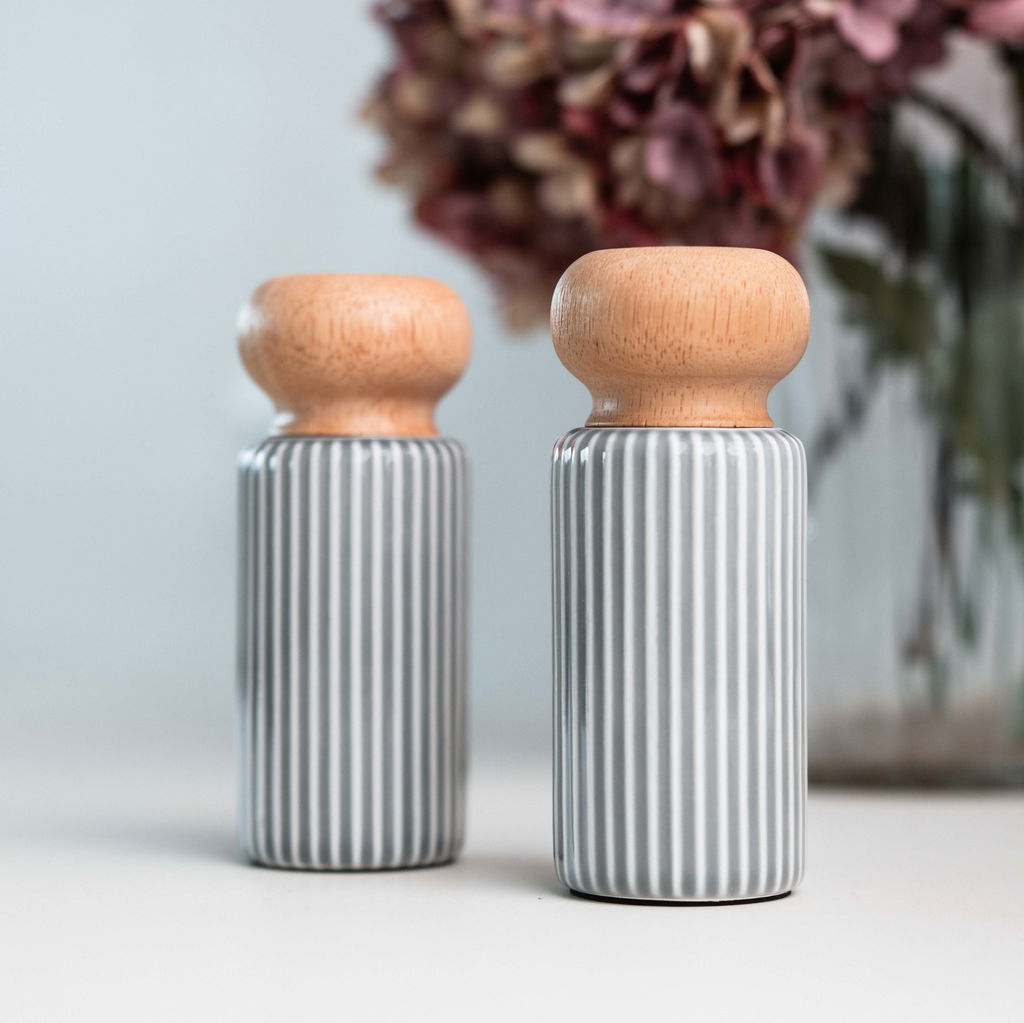 Kværnene er fremstillet i grå keramik, der giver et nordisk og stilrent udtryk. Materialet er robust, nemt at rengøre og tåler daglig brug. Toppen er lavet i lakeret gummitræ, der fremhæver træets naturlige struktur og giver et varmt og elegant modspil til den matte keramik.