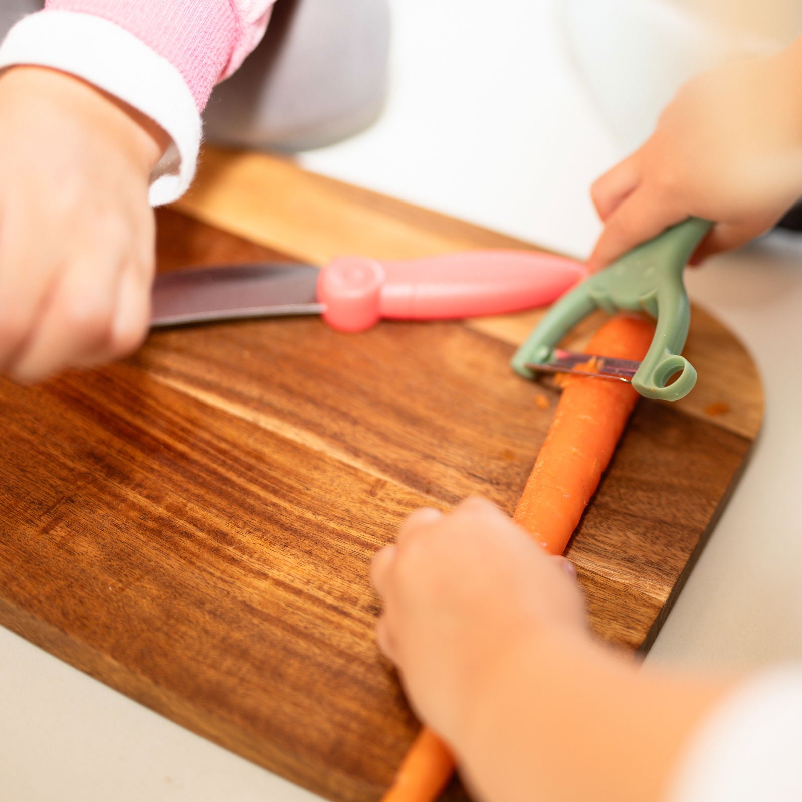 De to børnevenlige knive og den praktiske skræller er designet, så børnene kan være en aktiv del af madlavningen og føle sig som små kokke. En perfekt måde at kombinere leg, læring og hyggelige stunder i køkkenet sammen.