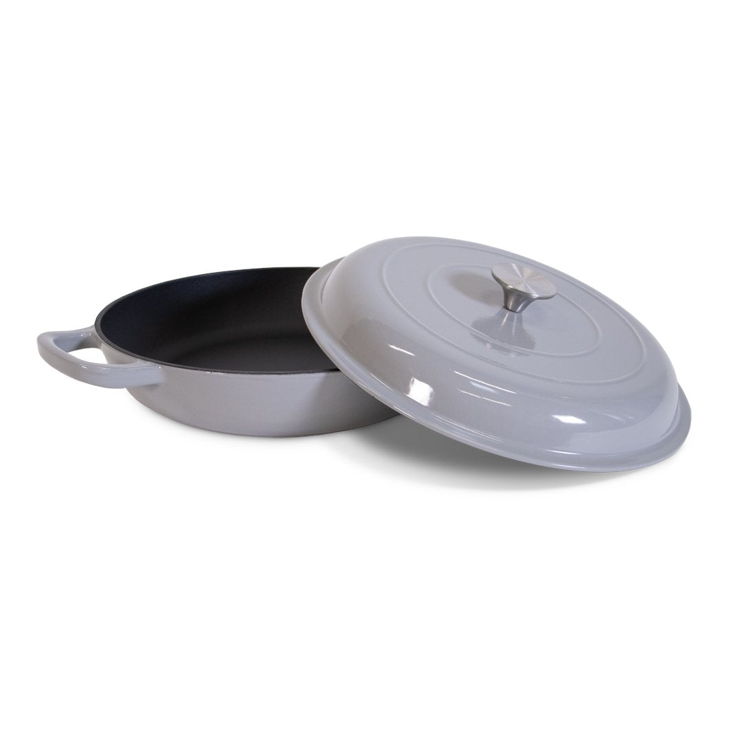 Min støbejerns sautergryde er til dig, der vil have en gryde der kan det hele – og som holder i mange år. Med en diameter på 30,5 cm og en kapacitet på 3,5 liter har den plads til store portioner, uanset om du laver simreretter, braiserer kød eller steger grøntsager. Den emaljerede overflade gør den både funktionel og smuk, samtidig med at den er nem at rengøre.